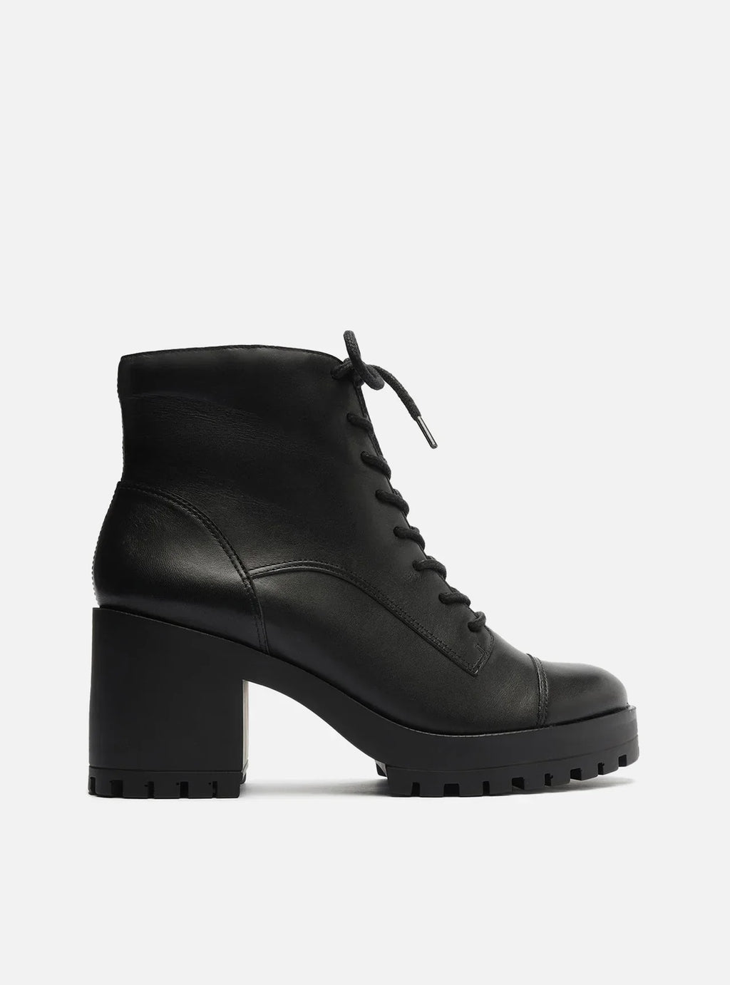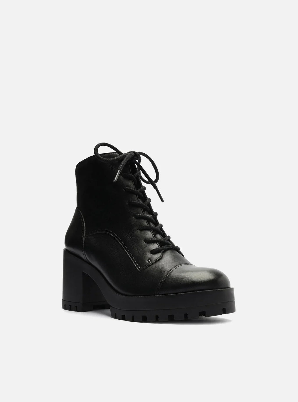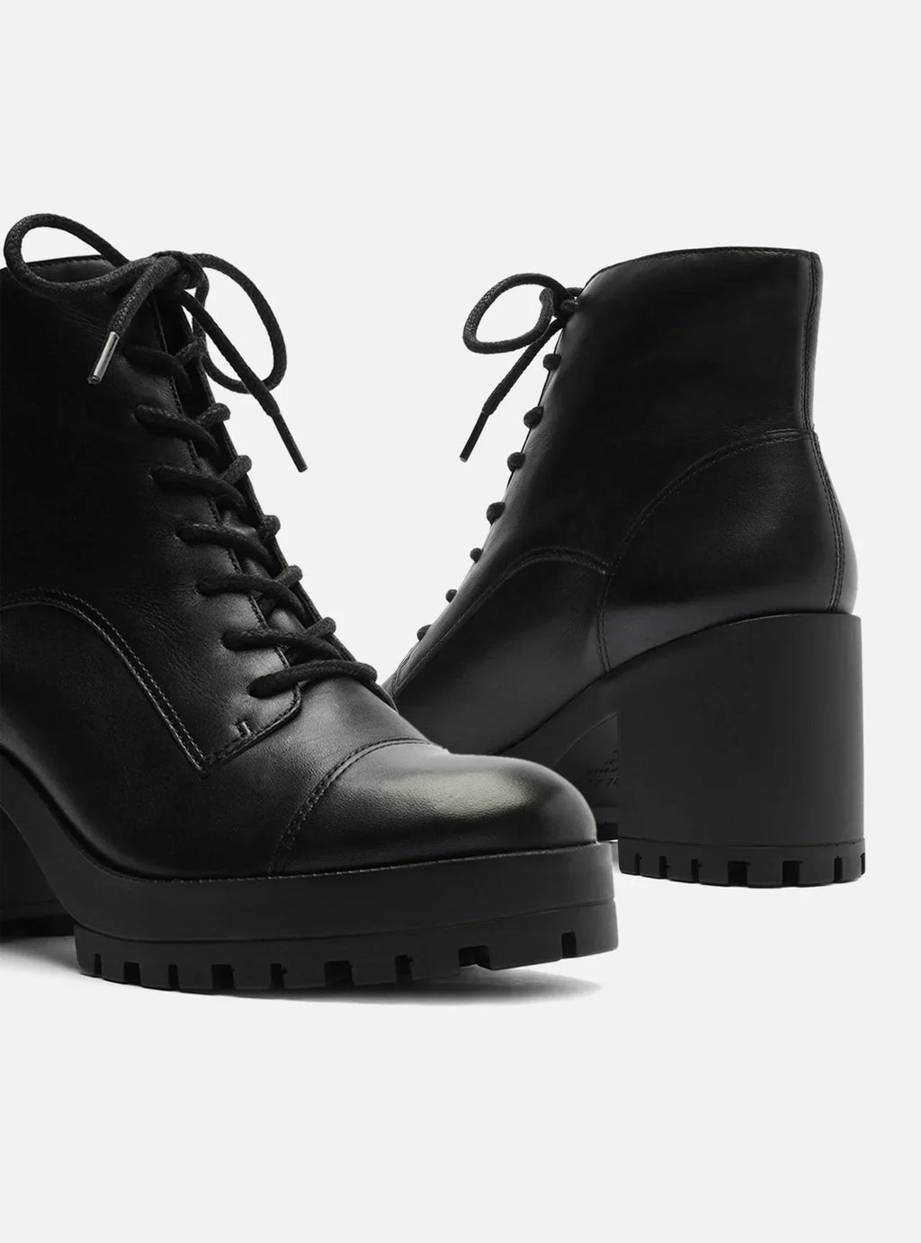 Descrição: Bota coturno preta de couro. O modelo tem cano curto, salto médio bloco e bico redondo. Possui base emborrachada tratorada preta. Traz costuras no cabedal e calcanhar e fecho em amarração por cadarços pretos cobrindo toda a parte frontal.