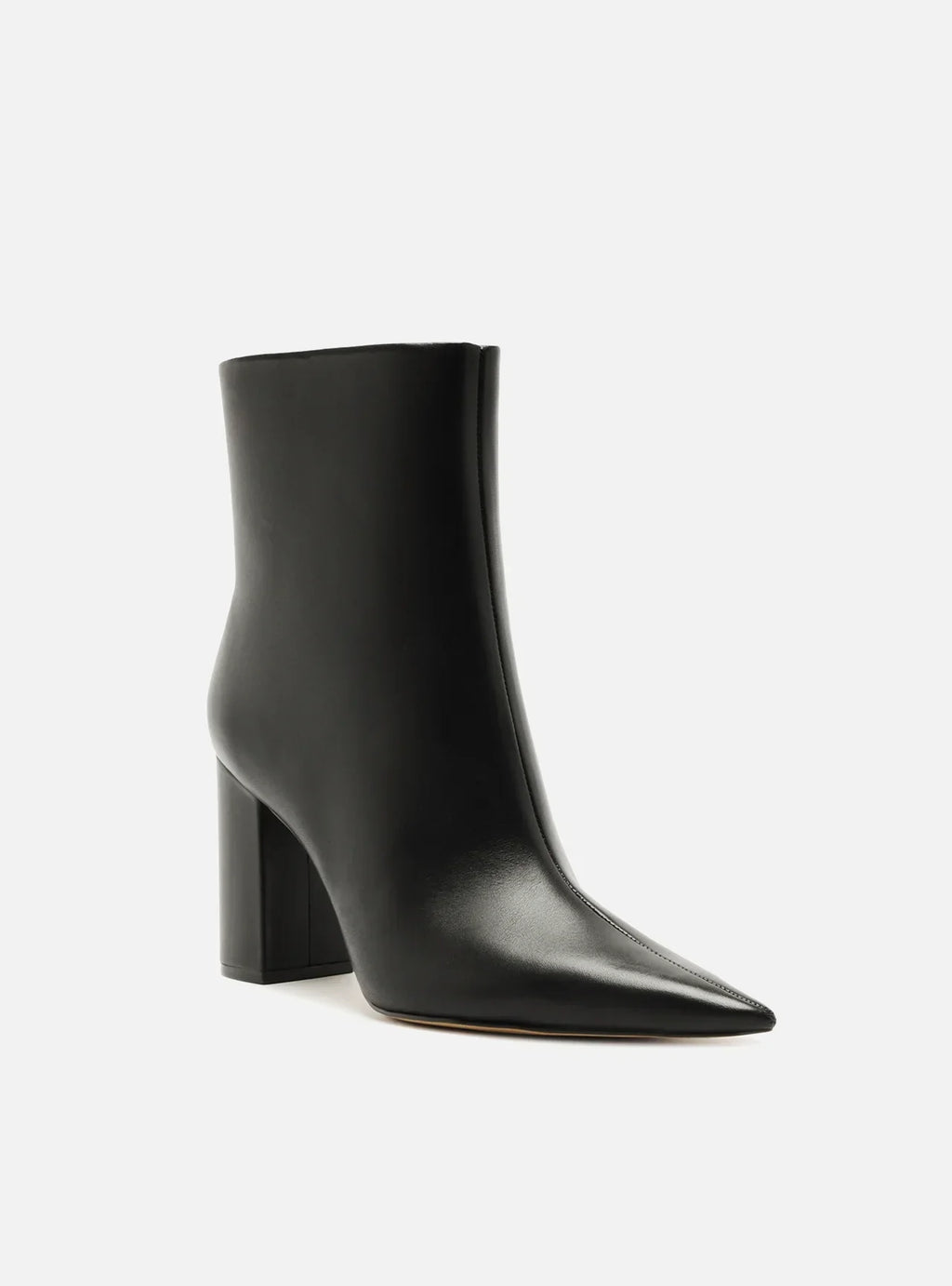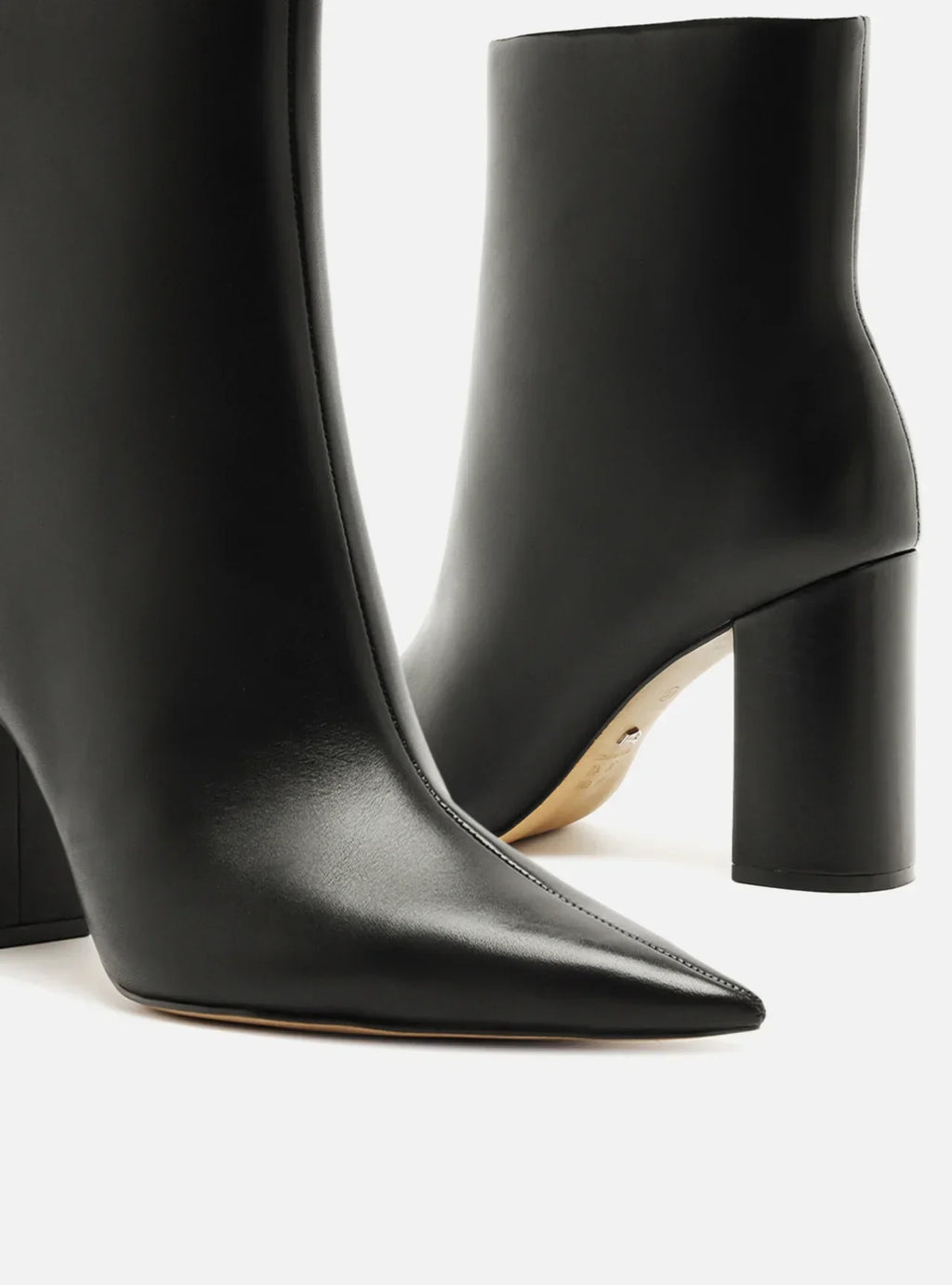 Descrição: Bota feminina marrom de couro. O sapato tem cano curto, salto alto bloco e ponta fina. Traz cabedal ajustado ao pé e fecho em zíper na lateral interna do cano.