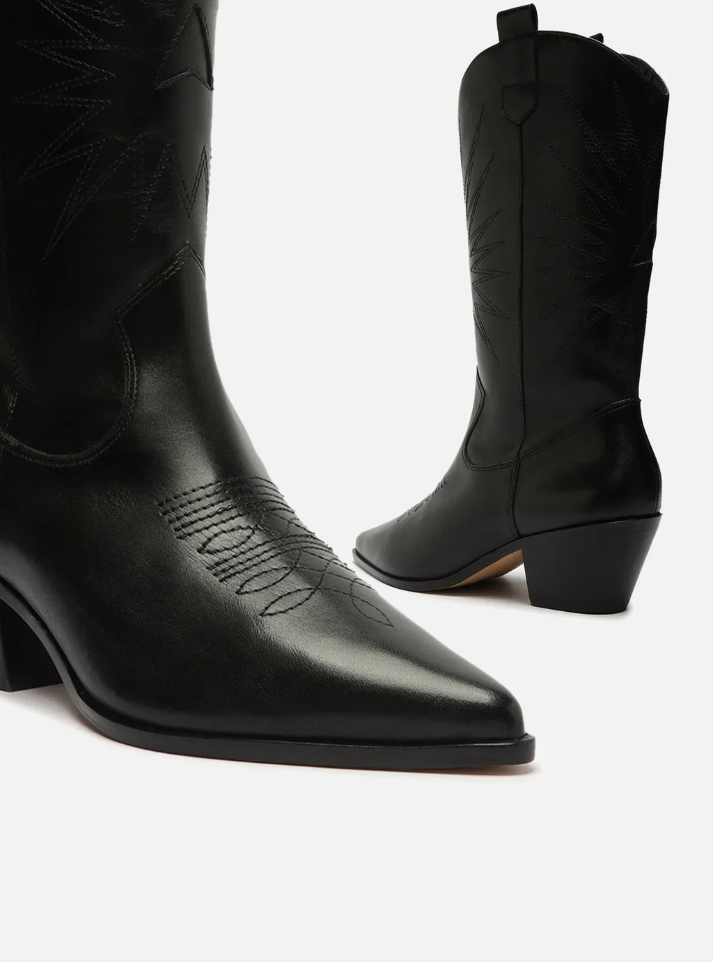 Descrição: Bota preta de couro. O modelo tem cano médio, salto baixo bloco em fachete e bico fino. Traz bordado western no cano e no cabedal. Com tiras como puxadores nas laterais do cano, facilitando o calce. Possui fecho em zíper na lateral interna do cano.
