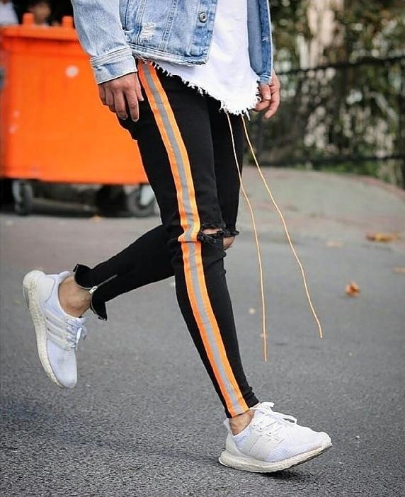 • Faixa lateral laranja em contraste com o jeans preto