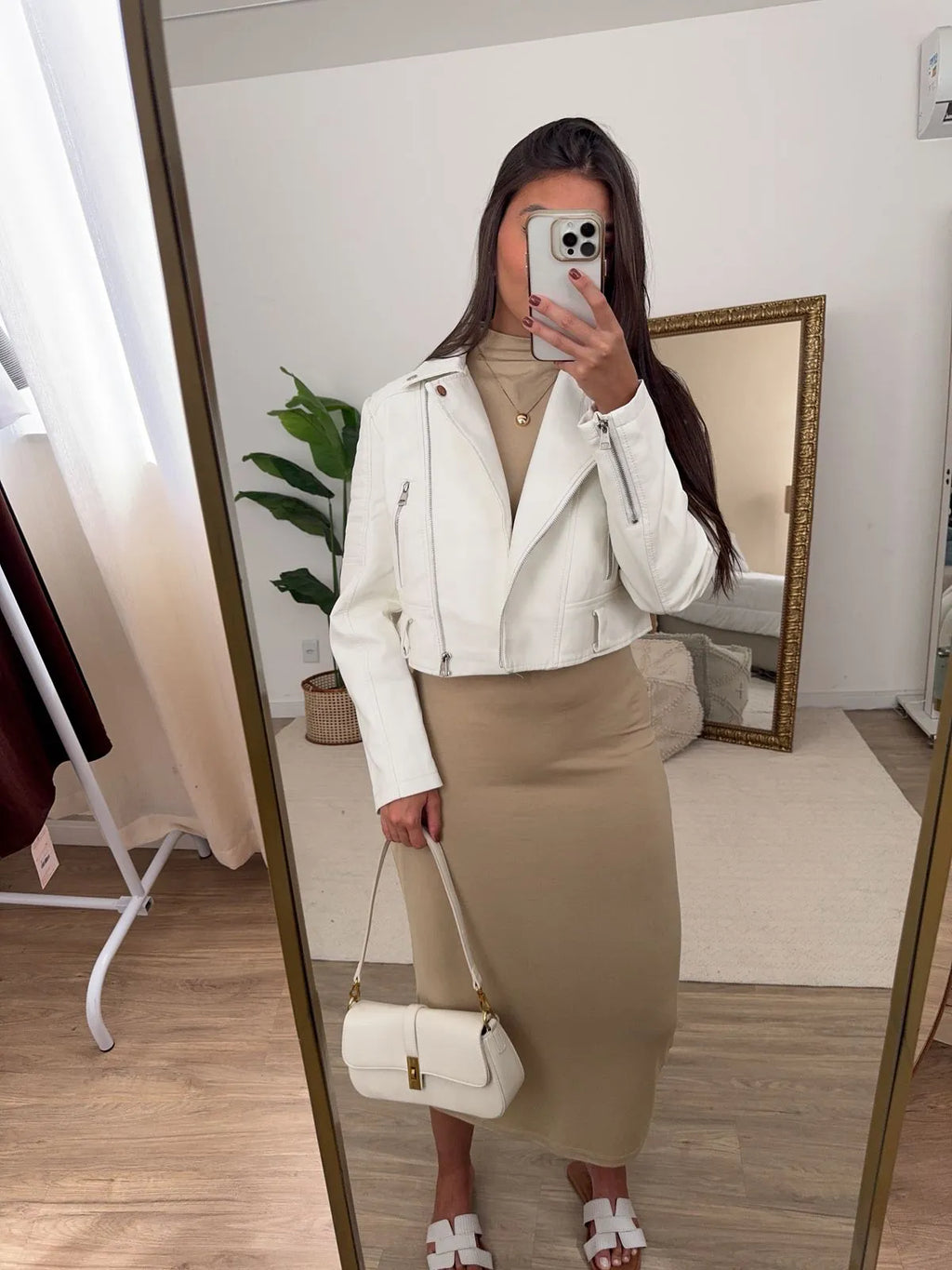Composto por Vestido e Jaqueta. A Jaqueta Dalia é a terceira peça perfeita para elevar qualquer produção nos dias mais frios. Confeccionada em couro PU, ela combina sofisticação e atitude com um toque urbano. O modelo conta com zíperes funcionais, cinto de regulagem removível e acabamento impecável, garantindo caimento estruturado e versatilidade em diferentes composições. 🌟