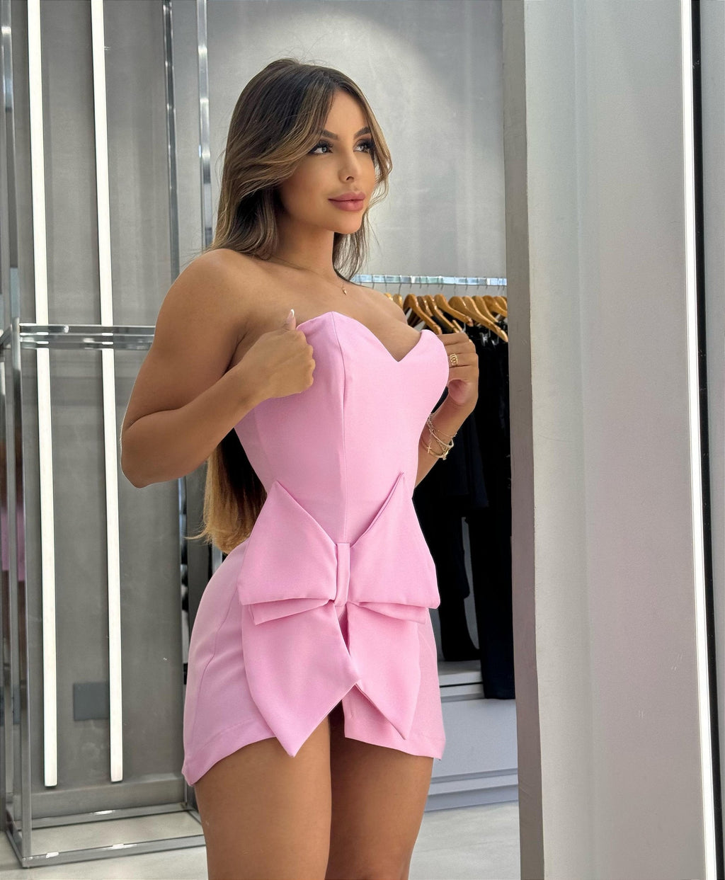 MEDIDAS DA MODELO: 1.70CM DE ALTURA, 95CM DE BUSTO, 64CM DE CINTURA, 100CM DE QUADRIL, 56CM DE COXA.